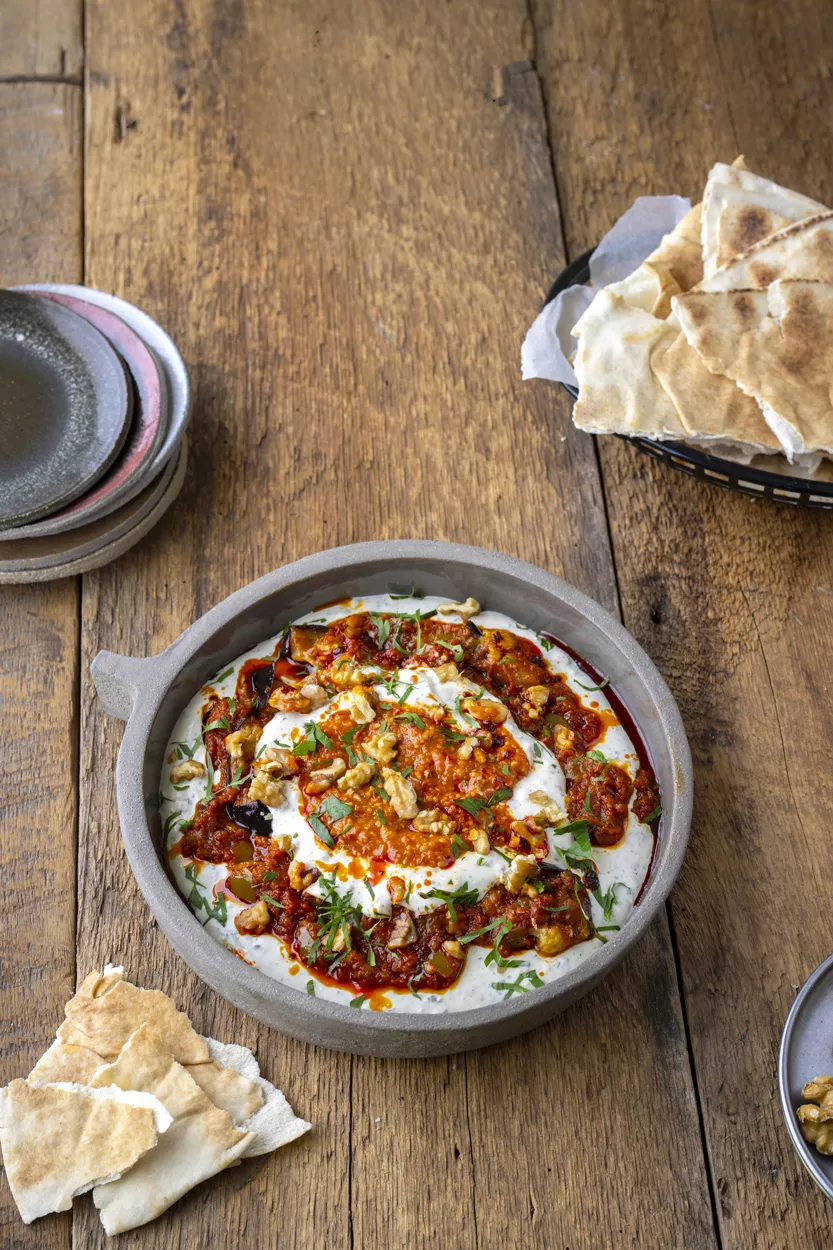 - Plaats vervolgens 20g Granoliva Yoghurtdip munt, citroen & za’atar – Labneh in het midden van de Matbuchasaus.